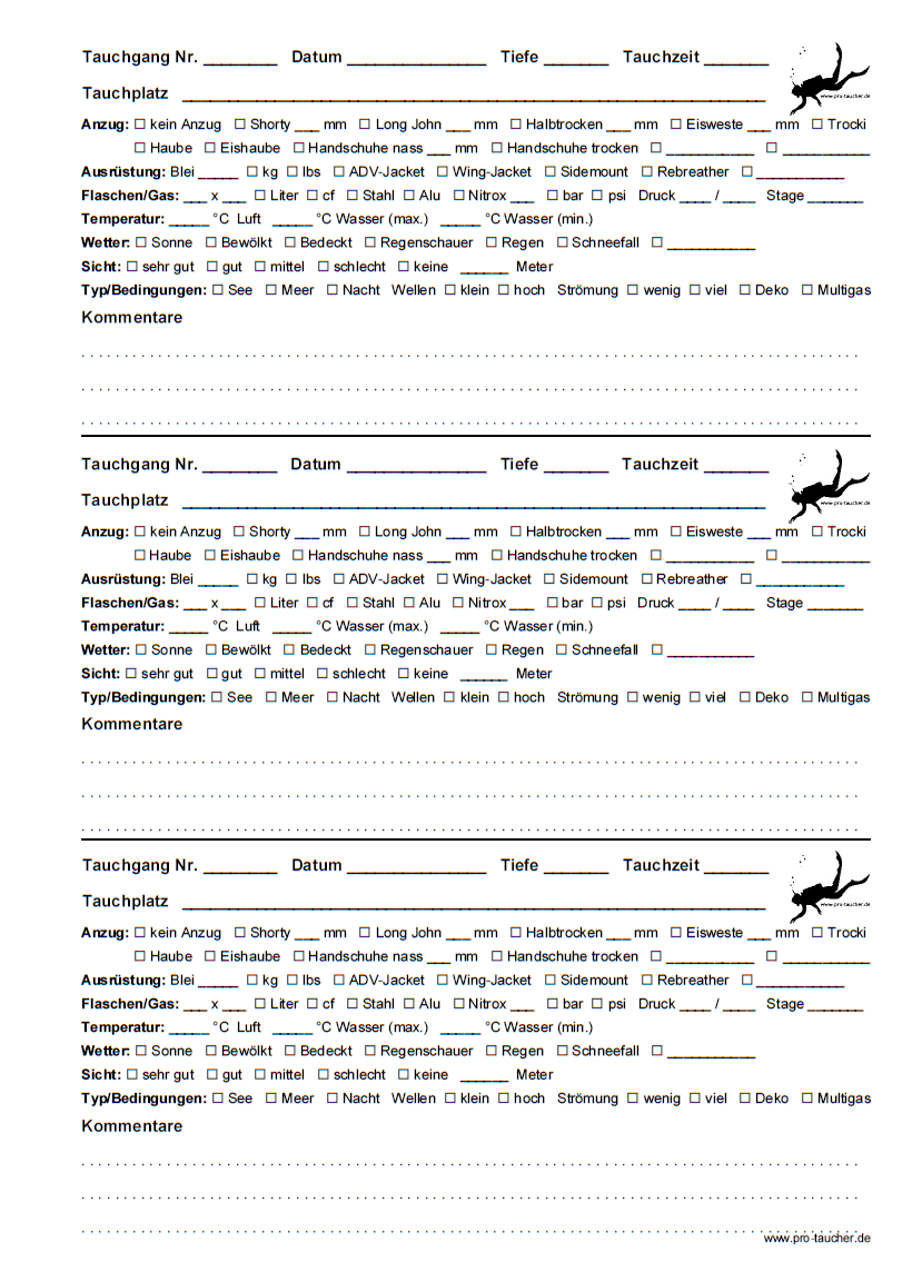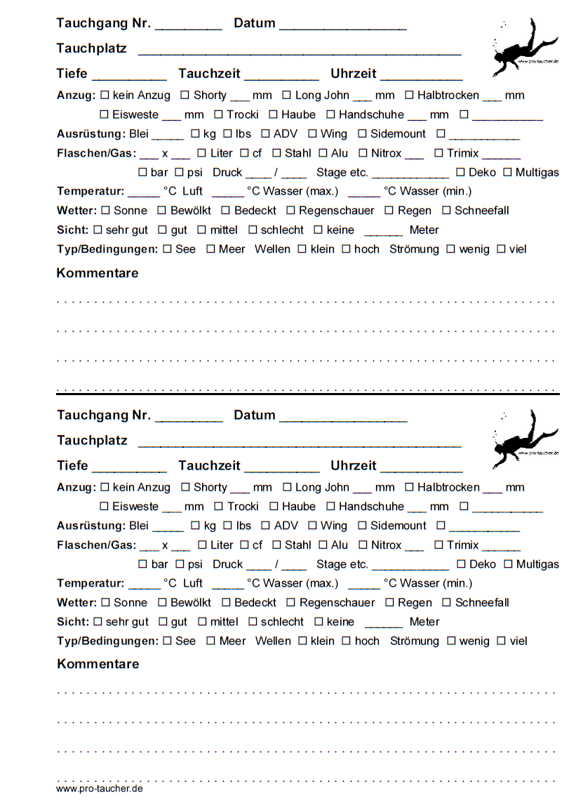 Unsere Pro-Taucher Logbucheinlagen für verschiedene Logbuchformate als Adobe PDF Dokumente zum Herunterladen und selber drucken: