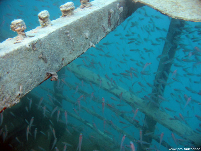 Das Wrack schaut zum Teil aus dem Wasser und liegt maximal 9 Meter tief. Die Sicht am Grund ist teilweise sehr schlecht, ist oben bei den Aufbauten aber gut. Ein auf alle Fälle lohnender Ausklang des Tauchtages.