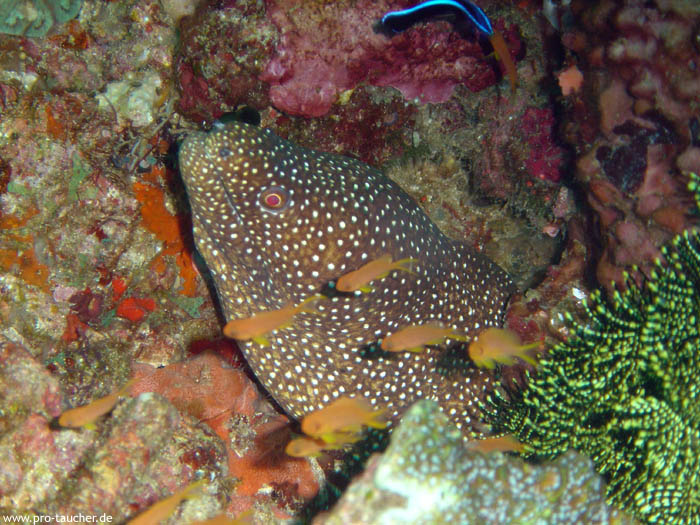 Schöner gemütlicher Drift durch schönen Korallengarten. Viele Anglerfische und Muränen. Riesige Pilz- und Tischkorallen (3 bis 4 Meter Durchmesser). In den Höhlen sind ab und an Fangschreckenkrebse zu finden.