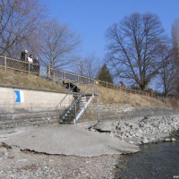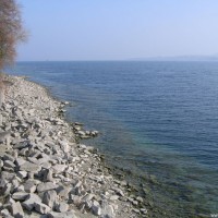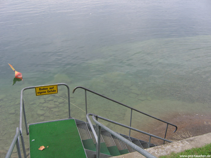 Im Wasser muß man sich erst einmal einige Meter (siehe Bilder) durch das seichte Wasser, das bis zur Hüfte geht, zur Steilwand vorarbeiten. Die Steilwand geht bis ca. 30 Meter, nach links Richtung Tauchplatz Seezeichen 24 auch tiefer. Am Fuß der Steilwand führt dann eine Halde tiefer in den See hinab.