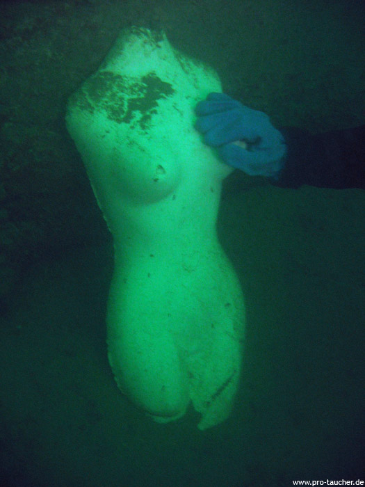 Die Steilwand geht bis ca. 25-30 Meter, dort führt dann eine Halde tiefer in den See hinab. An diesem Tauchplatz finden sich viele Dinge, die von Tauchern dort angebracht wurden, beispielsweise eine Schaufensterpuppe, ein Telefon und ein eingeschweißtes Erotikheftchen. In unmittelbarer Nähe der Schaufensterpuppe befindet sich das Wrack eines großen Ruderbootes mit Gartenzwerg am Bug.