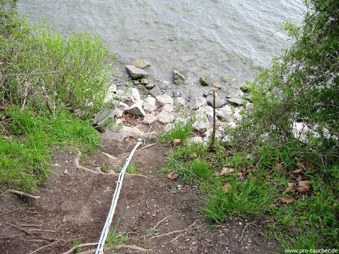 Einstieg entweder links von der Straße aus über eine steile Treppe (die an sich eher eine Mauer als eine Treppe ist). Hier war einmal ein Seil angebracht, um es überhaupt möglich zu machen, mit vollem Equipment die Treppe hinunter und wieder hinauf zu gelangen. An diesem Einstieg muss man sich erst einmal im hüfttiefen Wasser (bei normalen Wasserstand im Bodensee) zur Steilwand vorarbeiten.