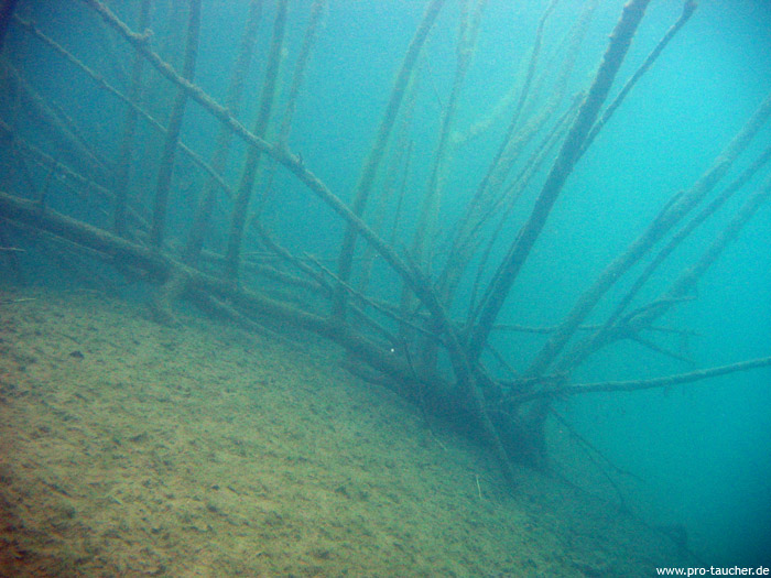 Einstieg 1: Über die alte Straße taucht man gemütlich zu zwei Übungsplattformen in geringer Tiefe, dem Segelboot in ca. 10 Meter Tiefe und dem versunkenen Wald auf der rechten Seite. Der weiße VW Polo, der lange quer über der Straße stand, musste dem Segelboot weichen und befindet sich jetzt irgendwo zwischen Einstieg 0 und Einstieg 5.