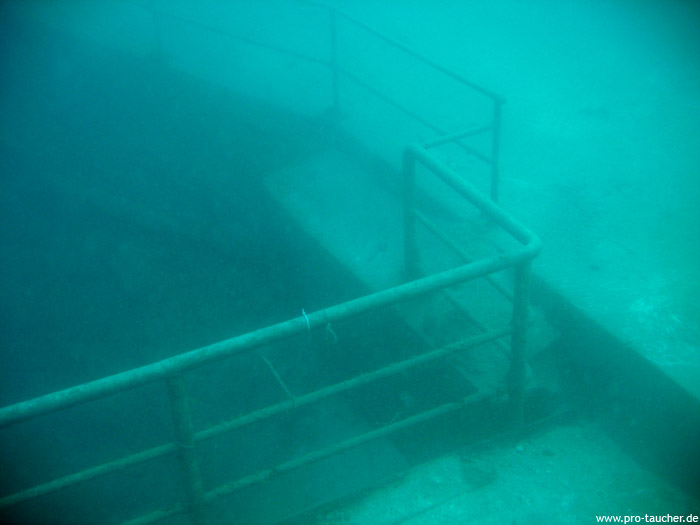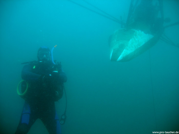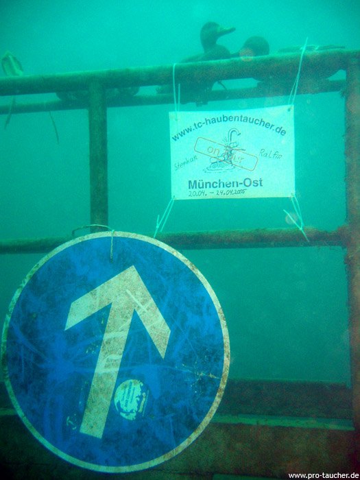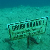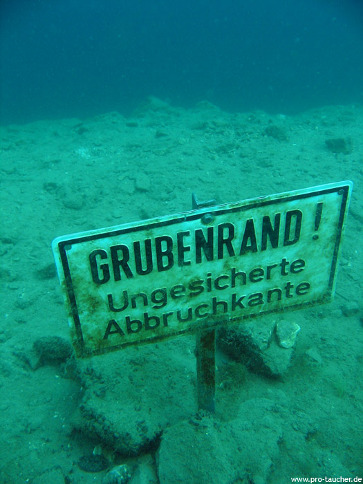 Einstieg 0: Der Ponton links von Einstieg 1, direkt die Wiese hinunter von der Tauchbasis aus, ist Einstieg 0. Hier befindet sich in 2-3 Minuten Entfernung freischwebend auf 17 Metern das Segelflugzeug. Es ist durch eine Boje gekennzeichnet und kann mit dem Kompass angetaucht werden. Nach links geht es zur "Pinwand" und zum VW Polo, bis dann die Fischzucht beginnt (Tauchverbotsgebiet!). Nach rechts gelangt man zu den Förderbändern und zur Steilwand, die bis kurz vor Einstieg 1 führt.