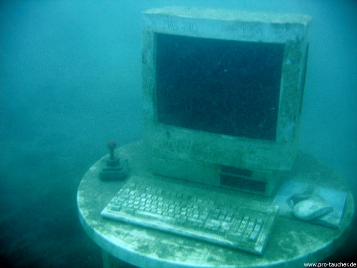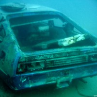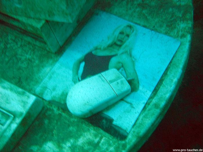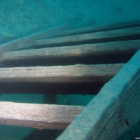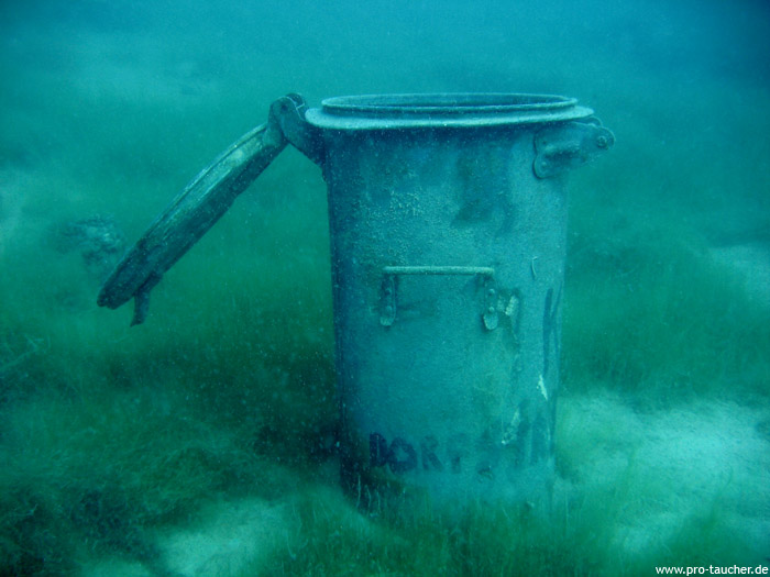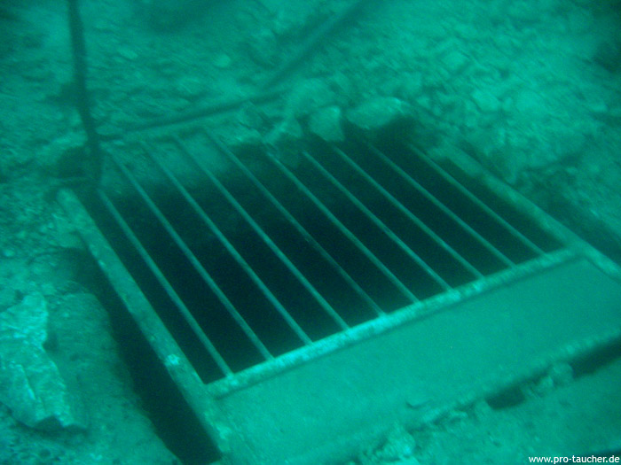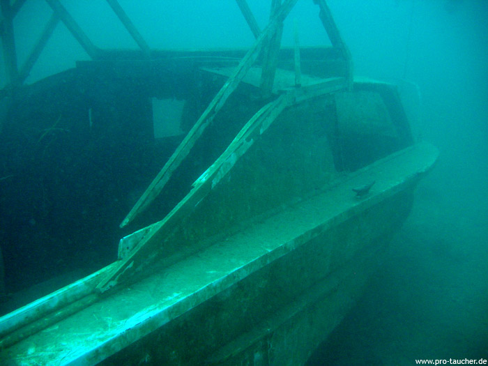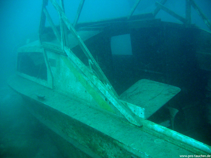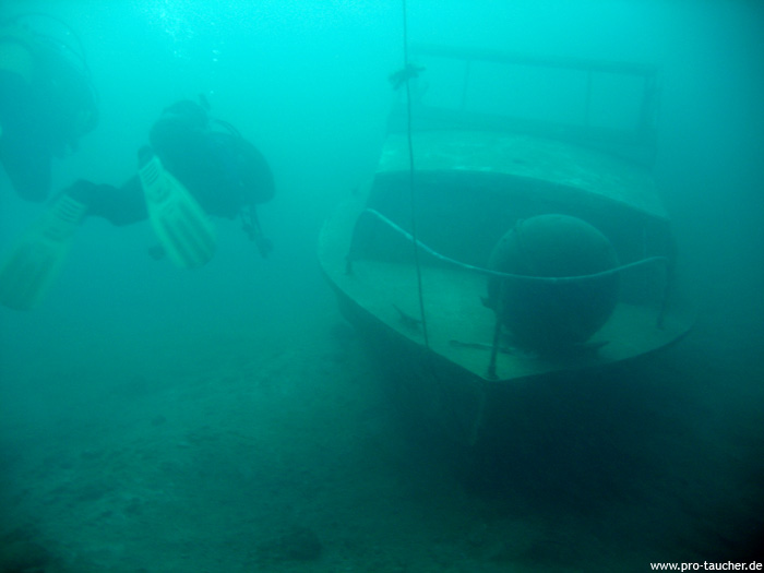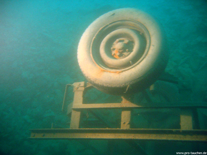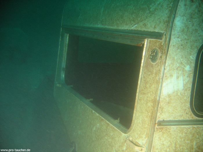 Einstieg 4: Zu diesem Einstieg muss man einen kleinen Fußmarsch von etwa 3-5 Minuten auf sich nehmen. Flossen anrödeln kann man bequem im Wasser sitzend an dem kleinen Sandstrand. Hier befindet sich 15 Metern Tiefe ein 8 Meter langes Bootswrack. Direkt daneben in Richtung Ufer steht ein PC. Außerdem kann man sich hier in 25 Metern und 37 Metern Tiefe an zwei Wohnwägen erfreuen. In Richtung von Einstieg 3, ca 15 Minuten entfernt, kann auf ca. 20 Metern ein Ortsschild von Lübeck und den blauen Mitsubishi PKW antreffen.